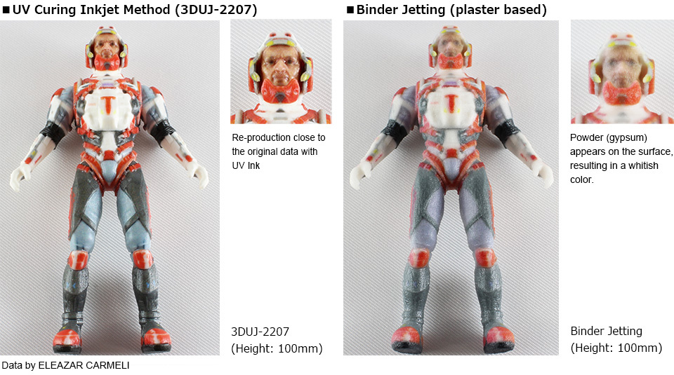 Modeling by color ink (CMYK,White,Clear) can achieve 84% of the Fogra 39L color gamut and cover 90% of SWOP gamut. With a color binder jet 3D printer, powder (plaster) appears on the surface, resulting in a whitish color, but using the UV curable inkjet method, the "3DUJ-2207" has beautiful color expression due to modeling with highly transparent color ink.