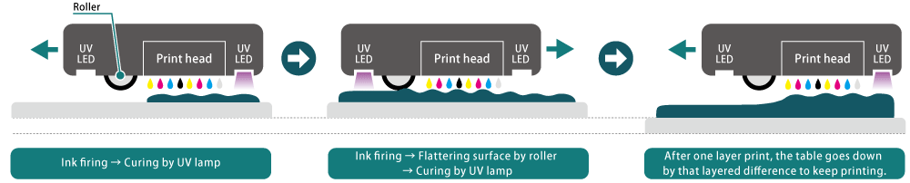 [3DUJ-553] applies UV ink curing by irradiation of UV (Ultra Violet). The UV LED of curing source hardly exerts thermal influence to object and start time for lighting-up is not necessary. Long life and power saving can reduce the running cost.