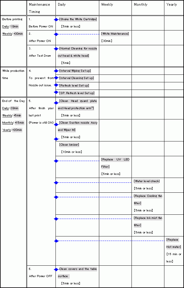 ・ [Daily]: Operate a Normal cleaning on White color and the color which had nozzle out.
