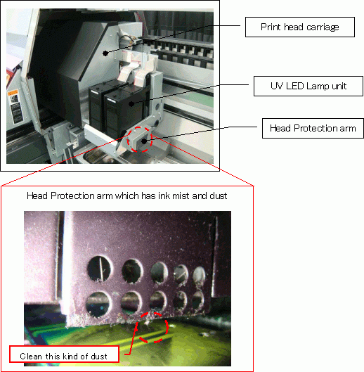 If you do not clean the head plate, the contaminants will attract excess ink The collected ink will drop on the media surface. It will also cause nozzle out issues.